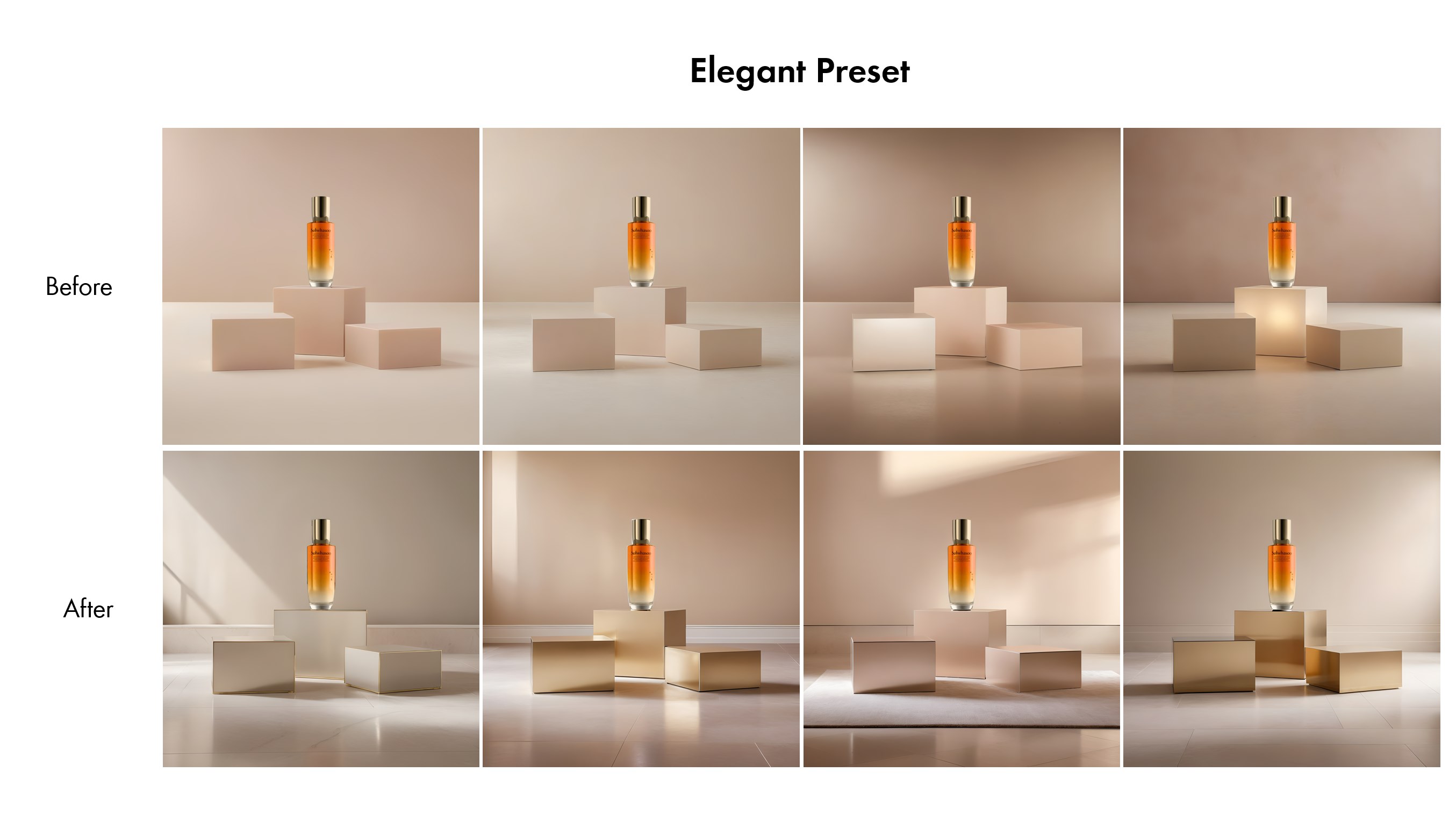 This approach also allows us to simplify one of the most time-consuming parts of visual production — creating believable, beautiful backgrounds. By leveraging AI’s generative power, we can produce unlimited variations of realistic scenes that perfectly complement the product, saving countless hours while maintaining creative freedom and visual consistency.